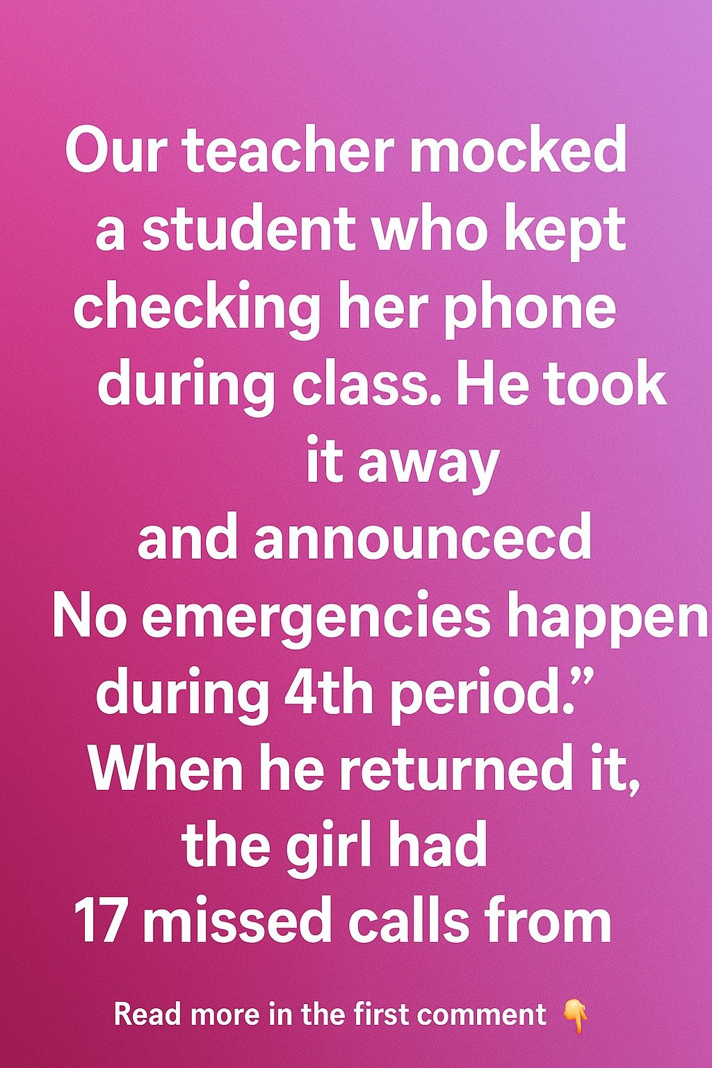 Our teacher mocked a student who kept checking her phone during class. He took it away and announced, “No emergencies happen during 4th period.” When he returned it, the girl had 17 missed calls from a number noneof us recognized, and the room suddenly felt much quieter than before. The laughter that had followed his comment faded as she stared at the screen, her face going pale. She didn’t say anything right away, just raised her hand with a calm that didn’t match her eyes and asked to step outside. The teacher hesitated, clearly annoyed, but nodded. The door closed behind her, and for the first time that day, no one whispered or checked their own phone.