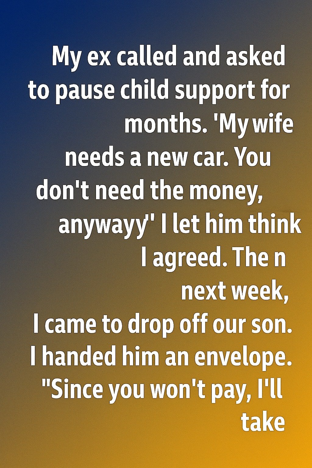 My ex called and asked to pause child support for months. “My wife needs a new car. You don’t need the money, anyway,” I let him think I agreed.The next week, when I came to drop off our son, I handed him an envelope. “Since you won’t pay, I’ll take responsibility in a different way,” I said calmly. Inside wasn’t a bill or a demand—just a neatly typed letter outlining the updated parenting schedule I intended to file with the court.