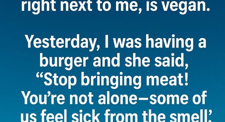 I eat my lunch at my work desk. My colleague, who sits right next to me, is vegan. Yesterday, I was having a burger, and she said gently, “Could you please not bring meat to the desk? The smell makes me feel sick.” Her tone wasn’t harsh, but I could tell it made her uncomfortable. I didn’t know what to say. I wasn’t trying to upset anyone it was just lunch.
