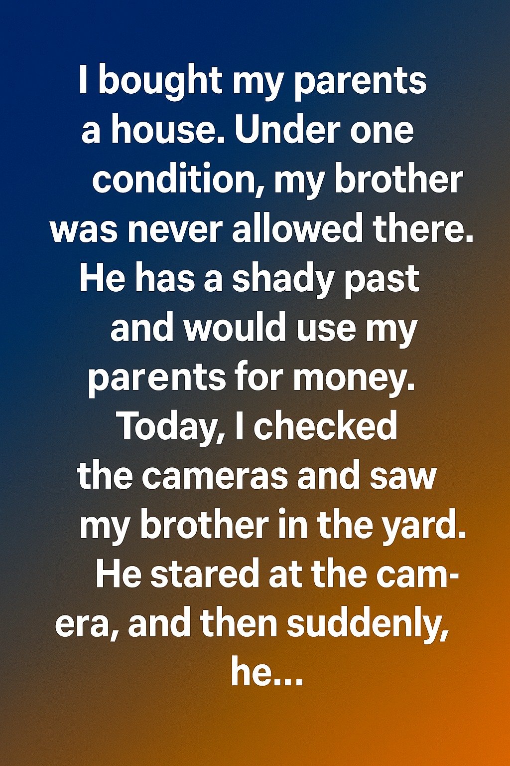 I bought my parents a house. Under one condition, my brother was never allowed there. He has a shady past and would use my parents for money. Today, I checked the cameras and saw my brother in the yard. He stared at the camera, and then suddenly, he…lowered his head as if he wasn’t sure what to do next. At first, I felt a familiar frustration rise in my chest. For years, my brother and I had lived on opposite sides of a line drawn by choices—some made by him, others made for him. I bought the house to give my parents a peaceful place to live, free from the stress that often followed his unpredictable visits. Seeing him on the camera stirred old concerns, but something about his posture made me pause. He didn’t look angry or demanding. He looked unsure, almost hesitant, like he was gathering the courage to be there at all.