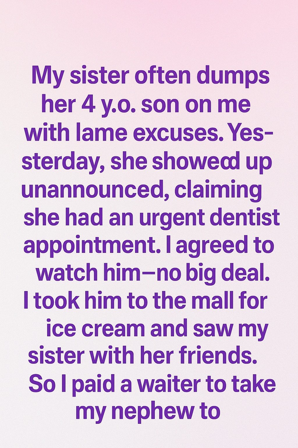 My sister often dumps her 4 y.o. son on me with lame excuses. Yesterday, she showed up unannounced, claiming she had an urgent dentist appointment. I agreed to watch him—no big deal. I took him to the mall for ice cream and saw my sister with her friends. So I paid a waiter to take my nephew to the play area for a few minutes so I could walk over and see what was going on. I didn’t want to embarrass her in front of her friends, but I also didn’t want to keep pretending her constant disappearing acts were normal. When I approached their table, she looked shocked—not guilty exactly, more like she’d been caught doing something she didn’t feel ready to explain.
