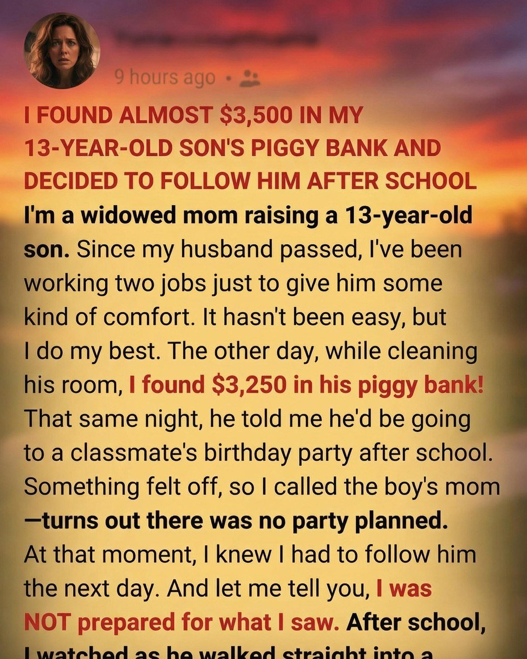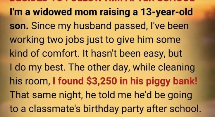 I FOUND ALMOST $3,500 IN MY 13-YEAR-OLD SON’S PIGGY BANK AND DECIDED TO FOLLOW HIM AFTER SCHOOL. As a widowed mom doing my best to raise my son alone, I was genuinely shocked when I opened his piggy bank while cleaning his room and discovered the large amount of money. For years, I’ve juggled two jobs to ensure he has a stable life, so seeing that much cash hidden away made my heart race with concern.