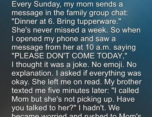 Every Sunday since Dad died, Mom cooked dinner at six. Same message. Same routine. So when that text arrived at 10 a.m., my brother and I knew something was wrong. Calls went unanswered. Messages stayed on read. Fear filled in every blank. We drove over anyway, rehearsing worst-case scenarios in silence.