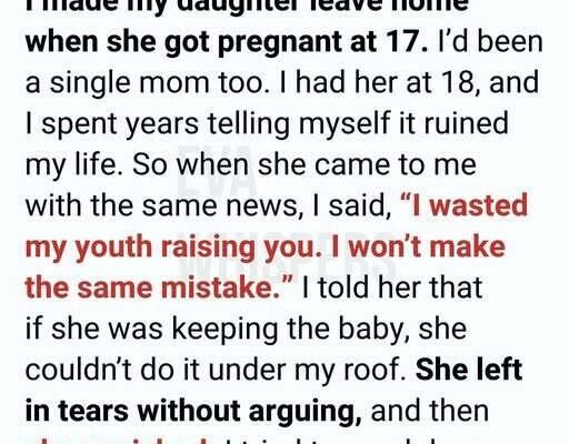 When my daughter told me she was pregnant at seventeen, I reacted with the same fear that had ruled my own youth. Instead of seeing her vulnerability, I saw a mirror of my past — the frightened eighteen-year-old girl I once was, the girl I had never forgiven. I convinced myself that turning her away was discipline, responsibility, even love, but in truth it was fear disguised as authority. My words—sharp, defensive, trembling—cut her deeply, and she left with nothing but a backpack and silent tears. I thought she would return. She didn’t.