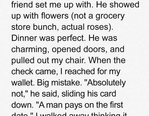 When my best friend Mia set me up with Eric, she promised he was a “total gentleman.” And at first, he seemed to be just that—roses, a personalized keychain with my initial, and effortless charm over dinner. He insisted on paying the bill, saying with a confident smile, “A man pays on the first date.” I left the restaurant floating, convinced I’d just had the best first date of my life.