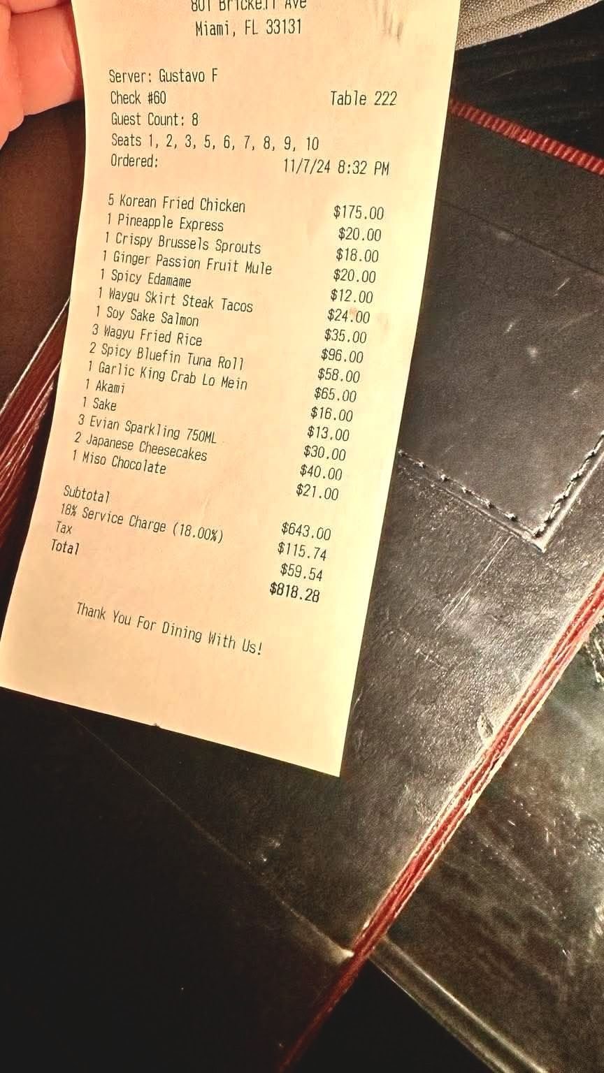 ![May be an image of ticket stub and text that says 'OUT ICRE.T HYC Niani, 33131 Server: Gustavo F Check #60 Guest Count: 8 Seats Ordered: Table 222 10 11/7/24 8:32 PИ 00 $20.00 00 $18.00 $20.00 5 Korean Fried Chicken 1 Tnp Express 1 rispy Brussels Sprouts Ginger Passion Fruit Mule Spicy Edamane haygu Skirt Steak Tacos Sake ไตอก HaAи Rice Bluefin Tua Ro1] Garlic King Crab Akasi Mein Sake 3 Evian Japanese Cheesecakes 75GML Miso Chocolate Swtotal Service Charge (18. 00%) Total (18.00%) $35 00 00 $16 00 $30, 00 $40. 00 $21 $21.00 00 $643. 00 $115.74 74 $59.54 54 $818.28 Thank You For Dining With Us!'](https://scontent.fpnh5-4.fna.fbcdn.net/v/t39.30808-6/638537876_4006340559498709_3335899347715247262_n.jpg?_nc_cat=100&ccb=1-7&_nc_sid=e06c5d&_nc_eui2=AeG-N8rSPLm9rwJLsutgwEKRcfnHxuLwtuVx-cfG4vC25ZiGloRc2Thy-amiayqkiPJAf24mPyFEy9IV4O3iHr72&_nc_ohc=VwwFx5rmEE8Q7kNvwGF3Vjr&_nc_oc=AdmriMsMMHwO0Ihwk4Vx9jtbFIjlDAeY8jjP7rxtFUkt2DbjDbSXlcOKKWxRoi42gHQ&_nc_zt=23&_nc_ht=scontent.fpnh5-4.fna&_nc_gid=pevdbBBFYoiwRiQcmuBKjQ&_nc_ss=8&oh=00_AfzVz-UTpN9oTxyfPKwdguxCAeX1RwVlHepNGDSl32In0w&oe=69ABA58A)