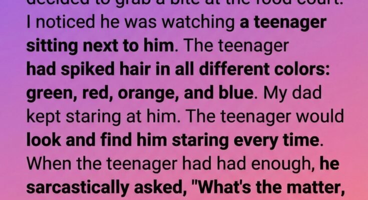 I took my 92-year-old father to the mall last weekend to buy a new pair of shoes, something sturdy but comfortable enough for his daily walks. After finding the perfect pair, we decided to sit down at the food court for a simple lunch. That’s when I noticed he seemed distracted. His eyes kept drifting toward a teenager sitting nearby, a boy with brightly colored spiked hair—green, red, orange, and blue blending together like a living rainbow. The young man shifted in his seat, clearly aware of my father’s repeated glances. I braced myself, unsure of what might unfold between two generations shaped by very different worlds.