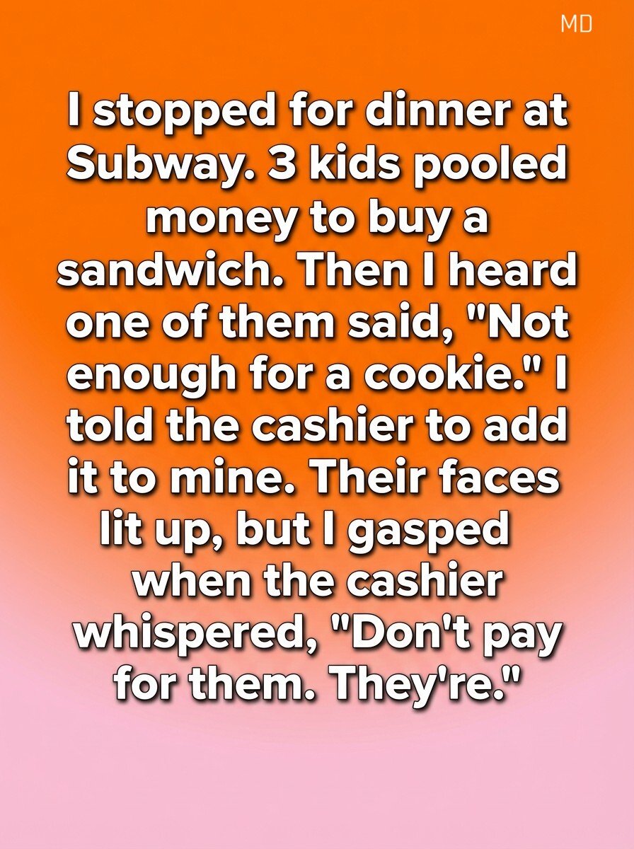After a long day at work, I stopped at a small sandwich shop, hoping for a quick meal before heading home. In front of me, three kids carefully counted coins and wrinkled bills on the counter, whispering as they tried to make their money cover dinner. They eventually ordered a single sandwich to share, but their excitement faded when they realized they couldn’t afford a cookie. Without much thought, I asked the cashier to include one with my order.