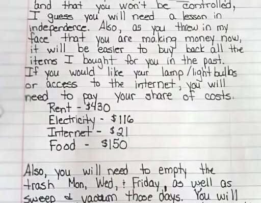 To emphasize her message, she provided him with a detailed bill for rent, food, and other expenses—amounting to over $700—effectively illustrating what life would be like if he genuinely desired to live independently.