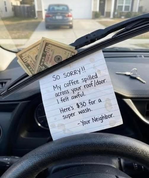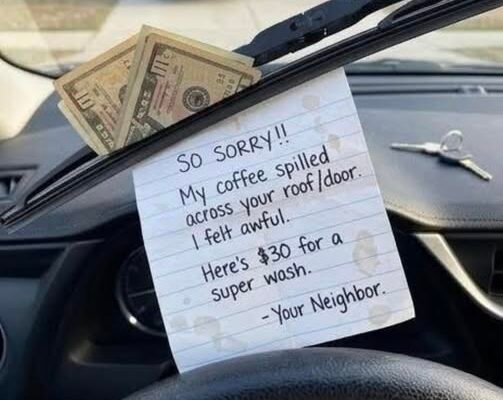 The note apologized for spilling coffee on my car and included the cash to cover a wash, signed as a neighbor. But nothing about it made sense there was no sign of coffee damage, and the broken wiper didn’t match what the note was claiming.