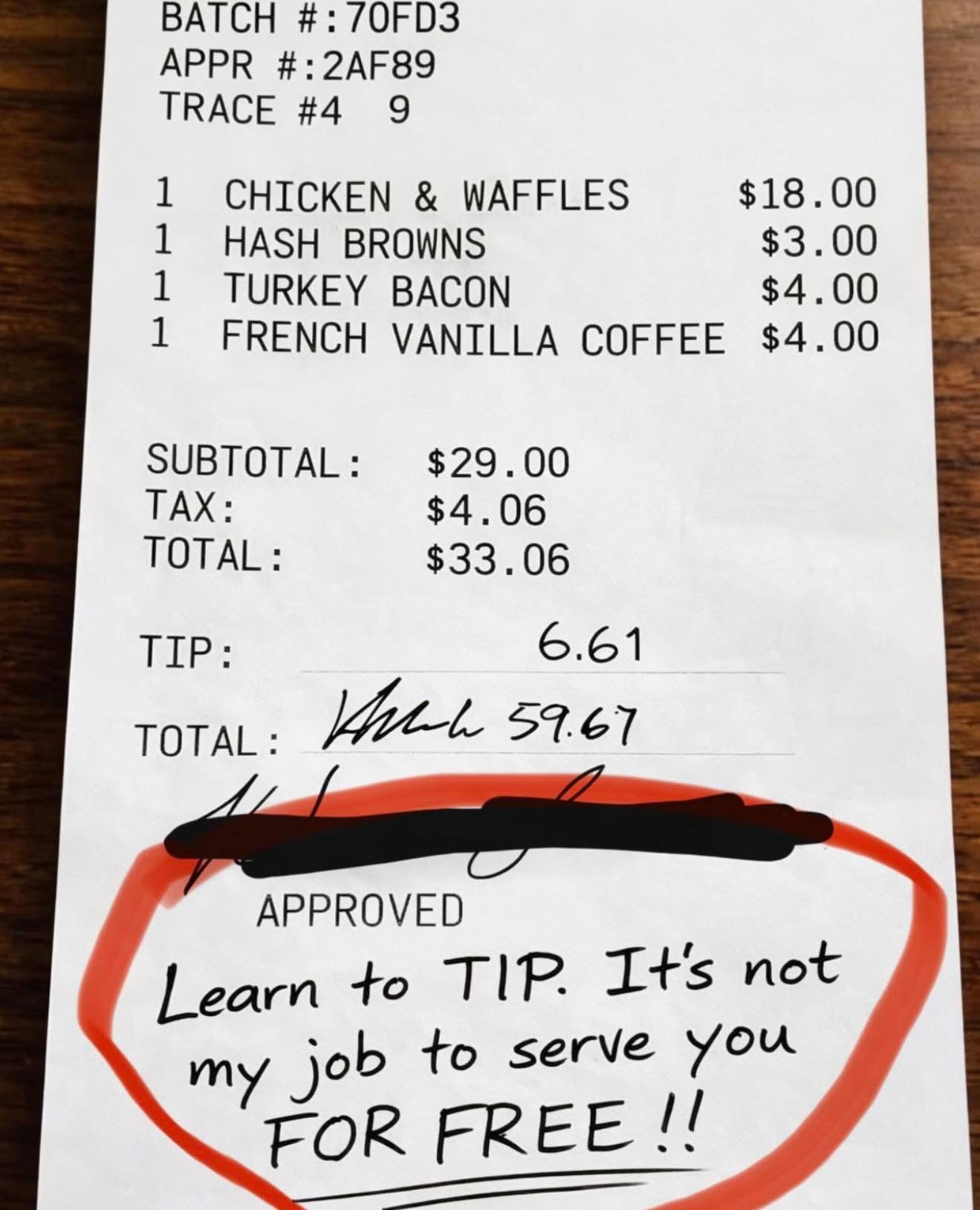 When I got my receipt back, there was a message written in red ink, all caps, saying I needed to learn how to tip and that serving me wasn’t supposed to be for free.