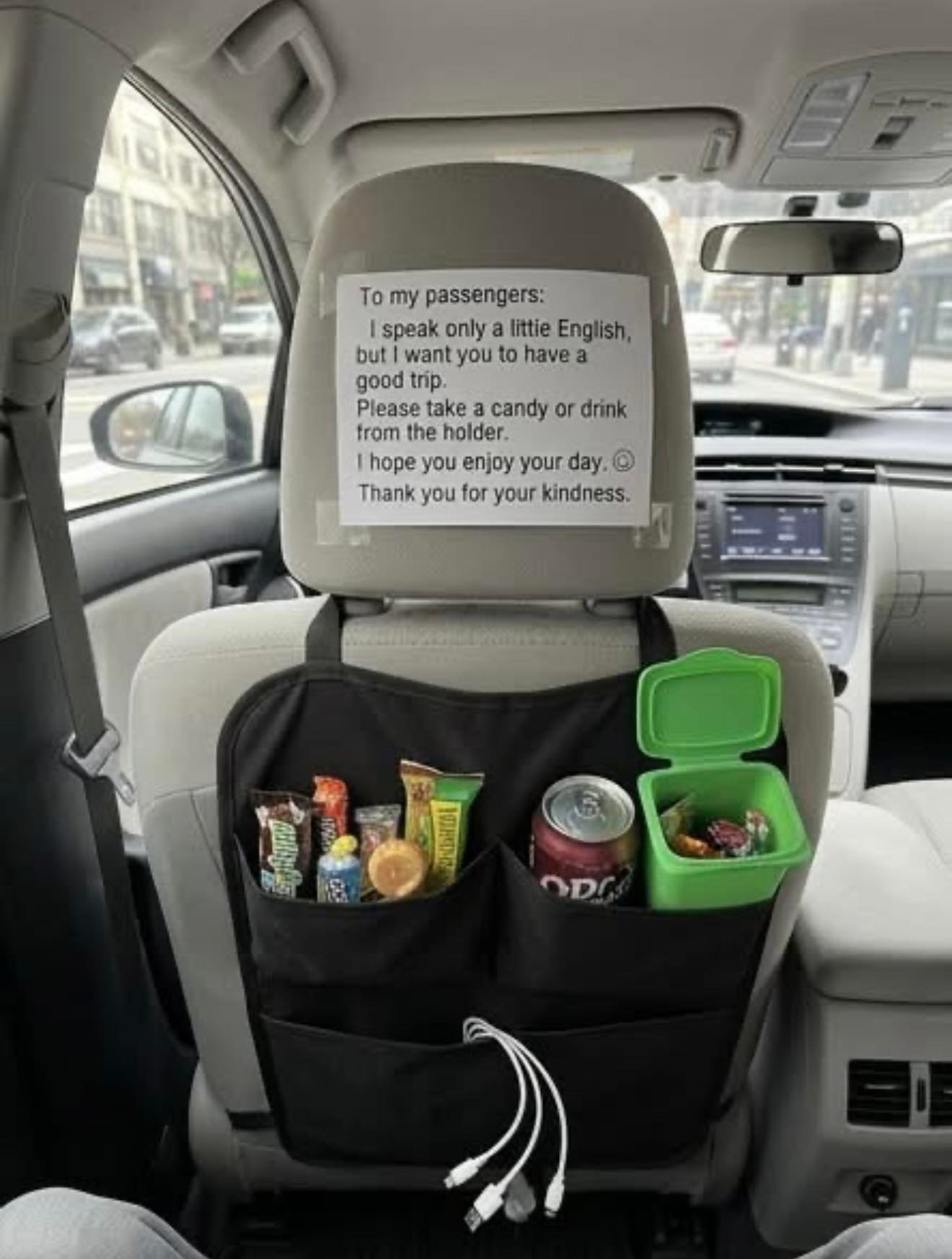 If you don’t want people grabbing snacks, maybe don’t put out a display inviting them to do it.🤦‍♂️May be an image of car and text that says 'To my passengers: I speak only littie English, but want you to have good trip. Please take candy or drink from the holder. hope you enjoy your day. Thank you for your kindness. っaさを ODC'