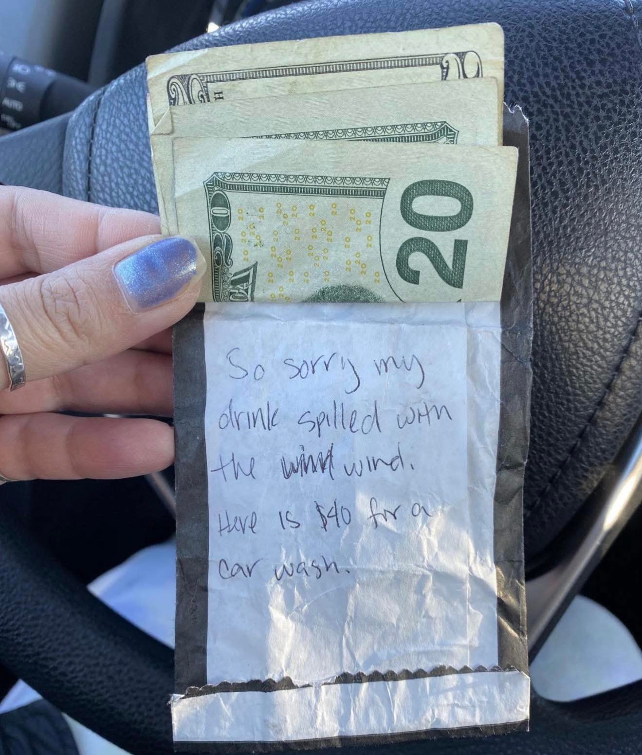 The driver pulled over and handed me $40 with a note saying to get a car wash, but that obviously doesn’t fix the situation. I took it so they’d leave, but then reported the incident and noted their license plate.