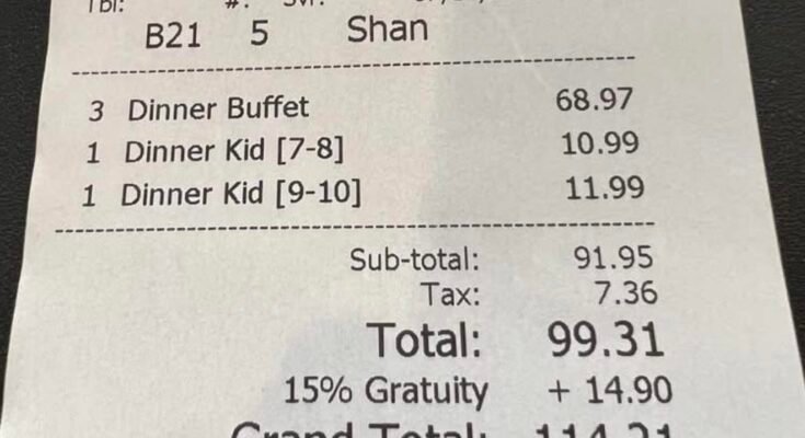 A family buffet outing started feeling a lot more expensive than expected. For five people, the meal came to $91.95 before tax. After tax, it was $99.31, which already felt close to a $100 meal. Then a 15% gratuity of $14.90 was added, bringing the total to $114.21. That’s where it starts to feel like the price jumps unexpectedly. What seems like a straightforward, affordable buffet quickly turns into something much higher once everything is added up. Buffets are supposed to feel simple and predictable, so seeing the total cross that $100 mark with an automatic gratuity can feel a bit surprising. It really makes you pause and think about how quickly a “casual” family meal can add up.![May be an image of ticket stub and text that says 'Parma, OH44134 44 134 (216) 741-3038 *(Dine-in)* #77 07/17/2023 03:44 03 Shan Tbl: B21 Svr: 5 3 1 Dinner Buffet Dinner Kid [7-8] Dinner Kid [9-10] 1 68.97 10.99 11.99 Sub-total: Tax: Total: 15% Gratuity Grand Total: 91.95 7.36 99.31 + 14.90 114.21 Thank you for your patronage! 7/17/2023 3:48:17 PM'](https://scontent.fpnh5-6.fna.fbcdn.net/v/t39.30808-6/655293000_122184509228429868_3253546645286871827_n.jpg?stp=cp6_dst-jpg_tt6&_nc_cat=109&ccb=1-7&_nc_sid=13d280&_nc_eui2=AeFxrMxhkuR7_P-JIwbDOFYsPKuzd-mHSGQ8q7N36YdIZOQIKxyLI5j-uHHxI5Abz_8ozC2GzlW4C6Qh5OVcHdlJ&_nc_ohc=O8fNpqwzZG8Q7kNvwFZMcjj&_nc_oc=Ados-pG6DM5xCvK1y42L_XgxmrtOPutBKlyAKXspuFyY0syVmB1TEg4YBM8F2cX-Kv8&_nc_zt=23&_nc_ht=scontent.fpnh5-6.fna&_nc_gid=nRuEoqebs1R-TNf4zC6u1g&_nc_ss=7a32e&oh=00_AfwSLTrygqCvwZV7J9a3w857QIJGAQeXbPy-kHw0LMSc9g&oe=69C86FD3)