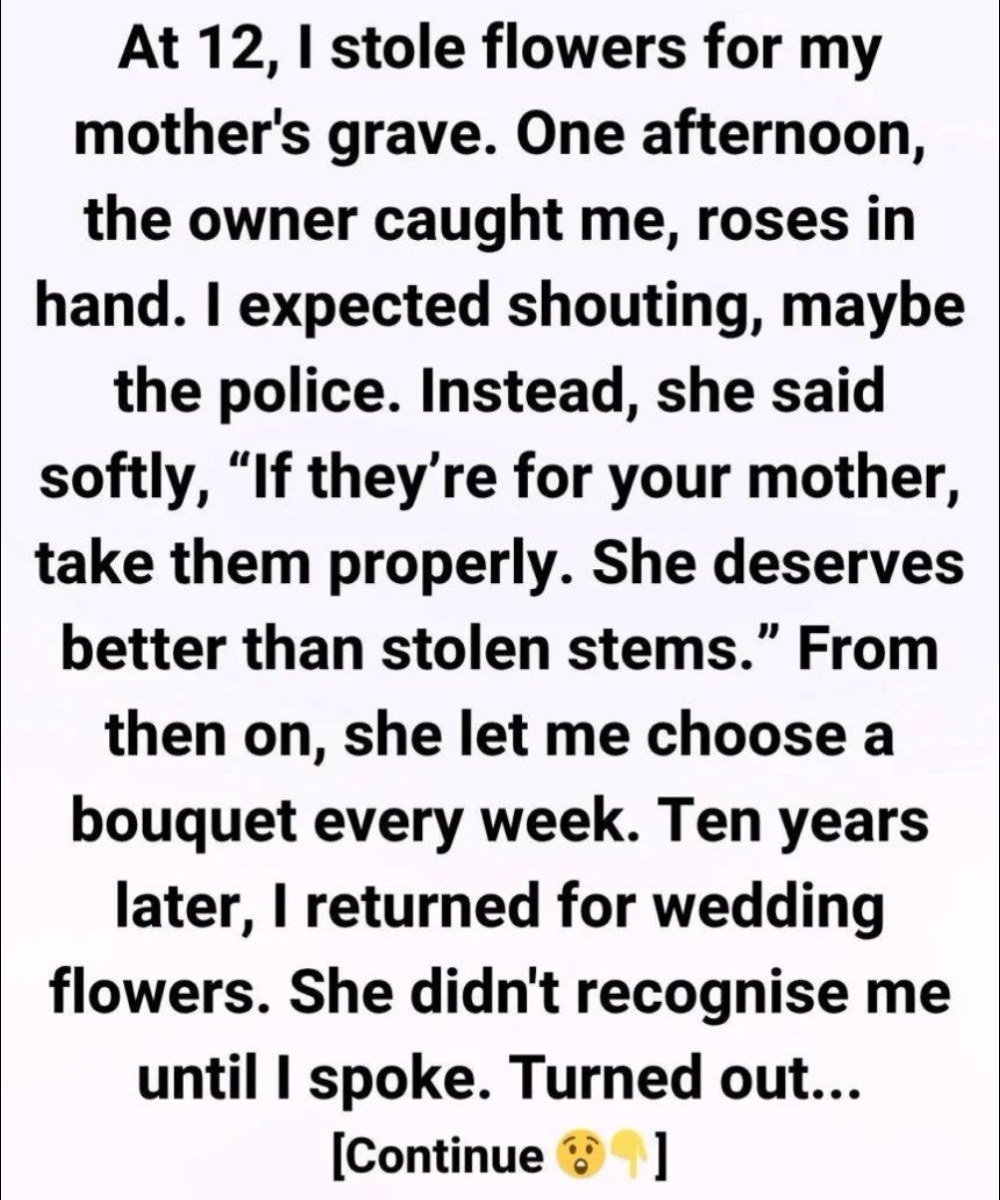 When the narrator was twelve years old, they coped with the loss of their mother by secretly taking flowers from a small neighborhood shop and placing them on her grave. Their mother had passed away the year before, leaving a deep emotional void, while their father was often absent, working long hours and too exhausted to notice their quiet grief. Without any money of their own, the child resorted to stealing flowers, not out of malice, but as a way to feel connected to their mother. Each bouquet became a symbolic gesture of love, a fragile attempt to maintain a bond with someone they had lost. For the child, these stolen flowers were more than just objects—they were expressions of remembrance, longing, and a need for comfort during a painful time.