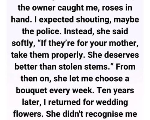 One afternoon, the shop owner caught me with a handful of roses. My heart pounded, expecting anger or scolding, but instead, the woman—wearing gentle, weary eyes—spoke calmly. She told me that if the flowers were for my mother, I should take them properly, because she deserved more than stolen stems. Her response shocked me. When I asked if she was angry, she simply shook her head and advised that next time I come through the front door. That single act of kindness changed everything.