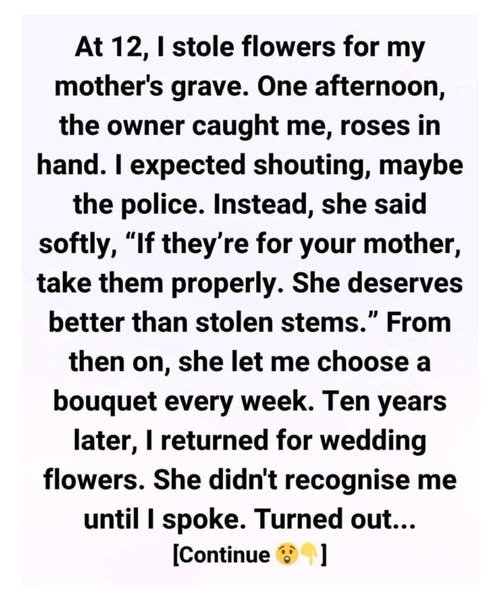 When I was twelve, I secretly stole flowers from a small shop down the street to place on my mother’s grave. She had passed away the year before, and our house felt hollow without her presence. My father worked long hours and rarely noticed when I slipped outside. I had no money, but bringing flowers gave me a sense of connection, as if beauty could bridge the silence she had left behind. Each stolen bloom felt like a small act of love, a way to honor her memory despite my young grief.