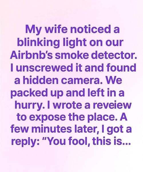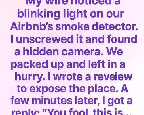 Our experience began quietly, after a long day of travel. We arrived at a rental that seemed to match the expectations set by its online listing—clean, comfortable, and peaceful. The evening unfolded as expected, with fatigue lowering our guard and routine taking over. However, a small detail—a faint blinking light on a smoke detector—caught my wife’s attention. Initially, it seemed like a harmless malfunction, but further inspection revealed a hidden lens behind the plastic, suggesting that the device was not just for safety, but for observation. In that moment, the entire atmosphere of the space changed. What was once a place of rest became a room where privacy was breached, and the silence felt oppressive, as if we were being watched. The intrusion was not only physical, but psychological. We packed quickly, guided not by logic, but by instinct to regain our sense of security and control.