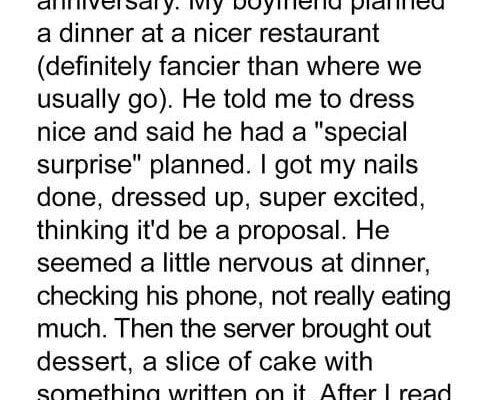 Yesterday marked our three-year anniversary. My boyfriend booked a reservation at a restaurant far nicer than anywhere we’d ever gone before. He told me to dress up and hinted at a “special surprise.” I got my nails done, picked out my best dress, and spent the entire afternoon imagining what was coming. I was sure this was it — the proposal I’d secretly hoped for. He seemed nervous at dinner, barely touching his food and constantly checking his phone.