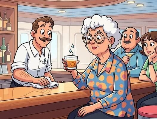 The lounge bar on the cruise ship was alive with music, clinking glasses, and the low murmur of conversations drifting across the room. In the middle of it all sat a cheerful elderly woman celebrating a remarkable milestone—her 80th birthday. She smiled warmly at the bartender and ordered a Scotch with two drops of water. When he handed her the drink and learned it was her birthday, he insisted it was on the house. She lifted the glass with quiet gratitude, clearly savoring not just the Scotch, but the moment itself.