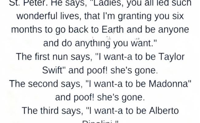 Three Italian nuns pass away peacefully and arrive at the Pearly Gates, glowing with excitement and curiosity. St. Peter greets them warmly, smiling as he reviews their lives in his massive golden book. After a long pause, he looks up and says, “Ladies, you have lived such faithful, selfless lives that I am granting you a very special gift. Each of you may return to Earth for six months and be anyone you wish, doing anything you desire.”