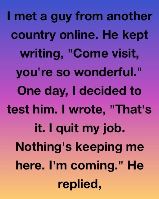 After months of this, curiosity got the better of me. I wanted to know if his feelings were real or just something he enjoyed saying. So one evening, I decided to test him. I wrote back, “That’s it. I quit my job. Nothing’s keeping me here. I’m coming.”