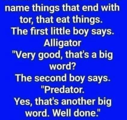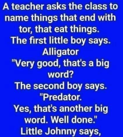 A teacher once asked her class a simple question to get their brains working. She smiled and said she wanted them to name things that end with “-tor” and eat other things. Hands shot up immediately. The first little boy stood proudly and said, “Alligator.” The teacher nodded approvingly, telling him that was a very big word and a great answer. The class murmured, impressed, and the boy sat down feeling accomplished.