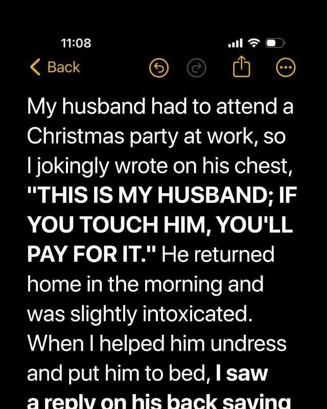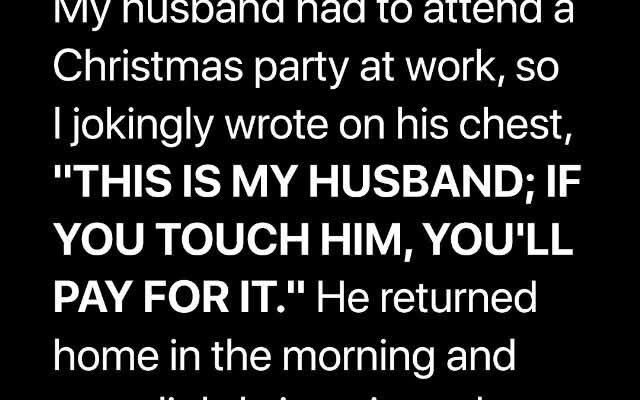 Unlike her husband, Micaela wasn’t a fan of office holiday parties where coworkers drank too much and let loose. “Thank God I don’t have to go to those,” she thought as she prepared Travis for his night out. Married for five years, she trusted him completely. So, with marker in hand, she wrote on his chest: “This is my husband; touch him, and you’ll pay – M.”