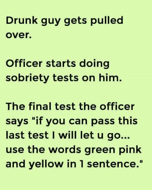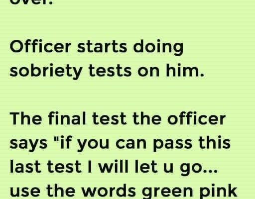 The man tilted his head, squinting like he was solving the hardest puzzle of his life. Then, slowly, a grin spread across his face. He straightened up, took a deep breath, and spoke clearly—far clearer than before. “The traffic light turned green, I stepped on the gas, then it turned yellow, and I said ‘whoa, slow down pink!’” For a split second, the officer just stared, processing what he had just heard. It wasn’t perfect. It wasn’t even logical. But somehow… it technically worked.