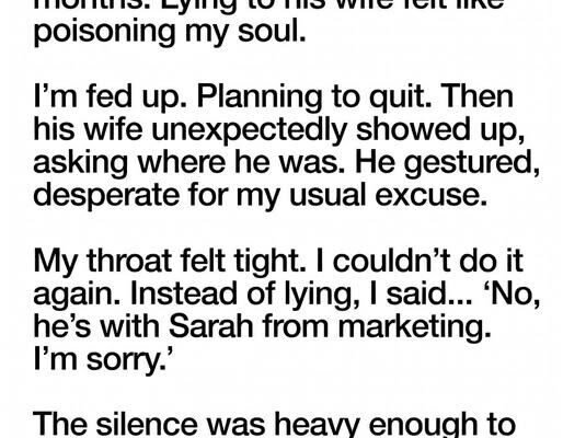 My throat went dry, my heart pounding so loudly I could barely hear anything else. I saw his hand move slightly, a subtle signal, the same one he always used when he needed me to lie. But something inside me snapped. Maybe it was exhaustion. Maybe it was guilt finally reaching its breaking point. I took a breath that felt like my first real one in months and said, “No. He’s not here. He’s with Sarah from marketing.” The words hung in the air, sharp and irreversible. “I’m sorry,” I added, my voice barely above a whisper.