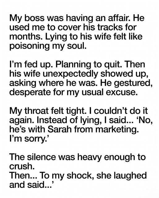 For months, I carried a secret that didn’t belong to me, and it ate at me a little more every single day. My boss, Daniel, had turned me into his shield, his excuse, his convenient lie whenever he needed to disappear. I covered his late nights, his “meetings,” his unexplained absences, all while knowing exactly where he really was. Every time his wife, Claire, called the office, my stomach twisted into knots. I heard the trust in her voice, the warmth, the certainty that her husband was exactly where he said he was. And every time, I betrayed that trust with a steady, practiced lie.
