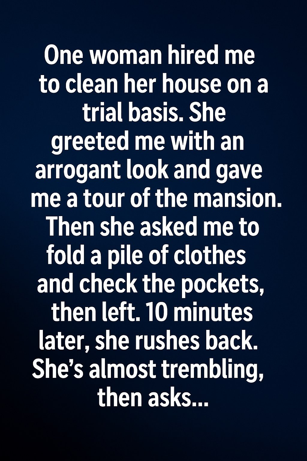 One woman hired me to clean her grand home on a trial basis. She greeted me politely, but there was a sense of distance, as if she expected disappointment. After a short tour, she left me with a neat stack of clothes to fold and asked me to check the pockets. I worked quietly, grateful for the opportunity and determined to do my best. The house was calm, filled with soft light and quiet expectations.