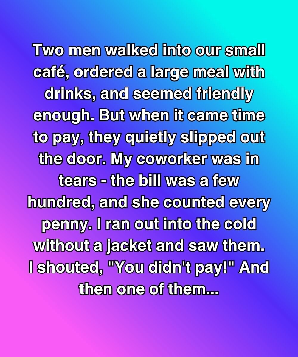 Two men walked into our small café one chilly evening, ordered generously, and chatted warmly with us as if we were old friends. They enjoyed their meal, laughed loudly, and didn’t seem in a rush. But when it was time to pay, they quietly slipped out the door without a word. My coworker, Mia, was on the verge of tears; the bill was well over a hundred dollars, and we both relied on every shift to make ends meet. Without thinking, I rushed outside into the cold, still wearing my apron.