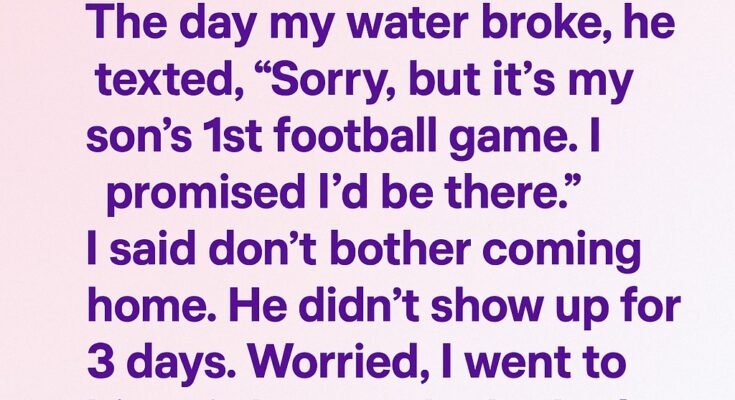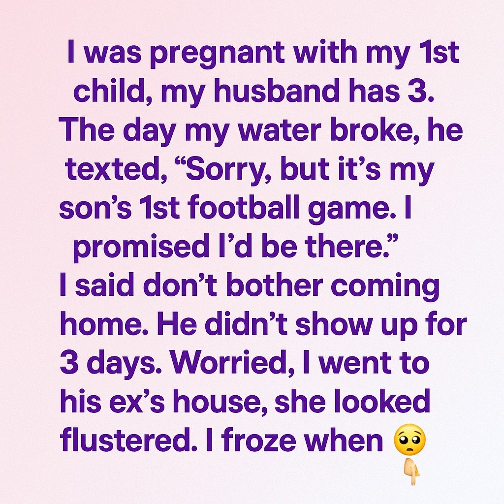 I was pregnant with my 1st child, my husband has 3. The day my water broke, he texted, “Sorry, but it’s my son’s 1st football game. I promised I’d be there.” I said don’t bother coming home. He didn’t show up for 3 days. Worried, I went to his ex’s house, she looked flustered. I froze when……I heard his voice coming from inside. He appeared in the doorway stunned to see me, still wearing the same jacket I watched him leave in days earlier. His ex-wife’s expression said everything before he even spoke.