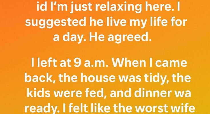 I’m on maternity leave with 2 kids. My husband often said I’m just relaxing here. I suggested he live my life for a day. He agreed. I left at 9 a.m. When I came back, the house was tidy, the kids were fed, and dinner was ready. I felt like the worst wife and mom ever! But then I noticed…