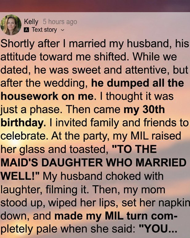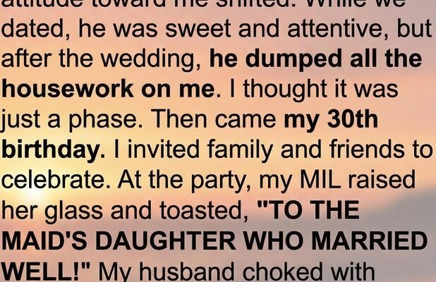 As my 30th birthday approached, I decided to host a small celebration with family and friends, hoping a warm gathering would reset the tone in our home. Instead, the party became an unexpected turning point. My mother-in-law raised her glass with a smile that didn’t quite reach her eyes and toasted, “To the maid’s daughter who married well!” Laughter followed from a few guests, including my husband, who even pulled out his phone to record the moment. The words landed like a stone in my chest—heavy, humiliating, and revealing more than she perhaps intended. The room felt smaller, the air tighter, and for a moment, all I could hear was the echo of that cruel toast.