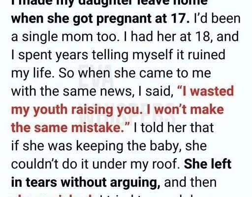 When my daughter told me she was pregnant at seventeen, I reacted with the same fear that had ruled my own youth. Instead of seeing her vulnerability, I saw a mirror of my past — the frightened eighteen-year-old girl I once was, the girl I had never forgiven. I convinced myself that turning her away was discipline, responsibility, even love, but in truth it was fear disguised as authority. My words—sharp, defensive, trembling—cut her deeply, and she left with nothing but a backpack and silent tears. I thought she would return. She didn’t.