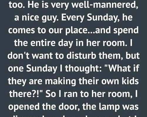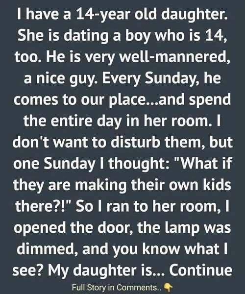 Her daughter’s boyfriend, also fourteen, is consistently polite and respectful. He greets the family warmly, removes his shoes at the door, and expresses gratitude each time he visits. The couple spends every Sunday afternoon together in the daughter’s room, which usually reassures the mother—until moments of quiet giggling behind a closed door cause her imagination to wander.