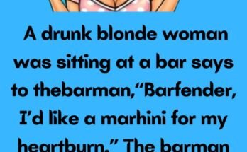 A drunk blonde woman was sitting at a bar says to the barman, “Barfender, I’d like a marhini for my heartburn.” The barman mixes her drink and puts in down …