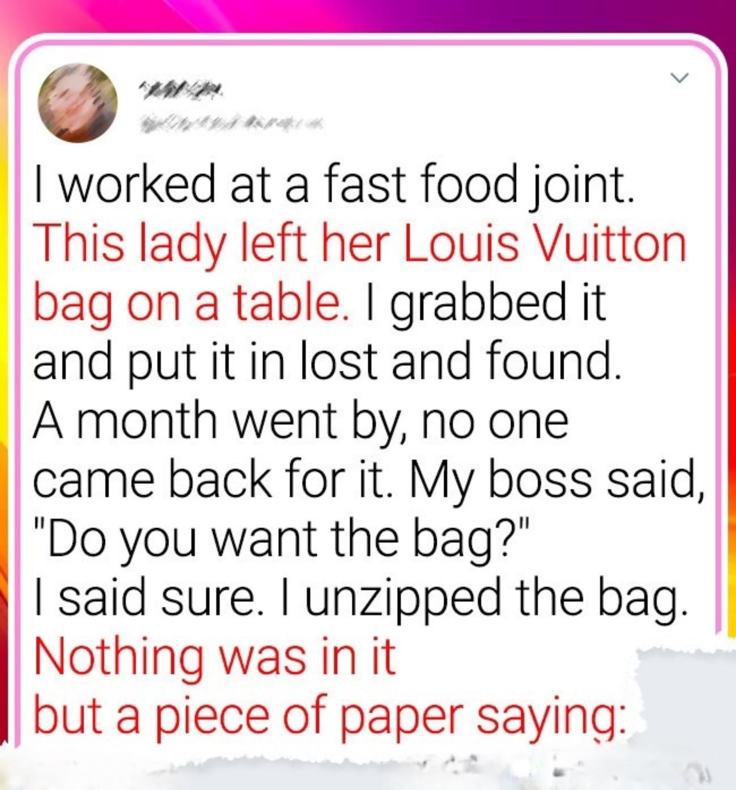 I worked at a small fast-food restaurant where people came and went in a hurry. One day, a customer accidentally left behind a Louis Vuitton bag on one of the tables. I turned it in to our lost and found right away, thinking someone would return for it quickly. A month passed, and no one claimed it. My boss finally said, “If you want it, you can take it.”