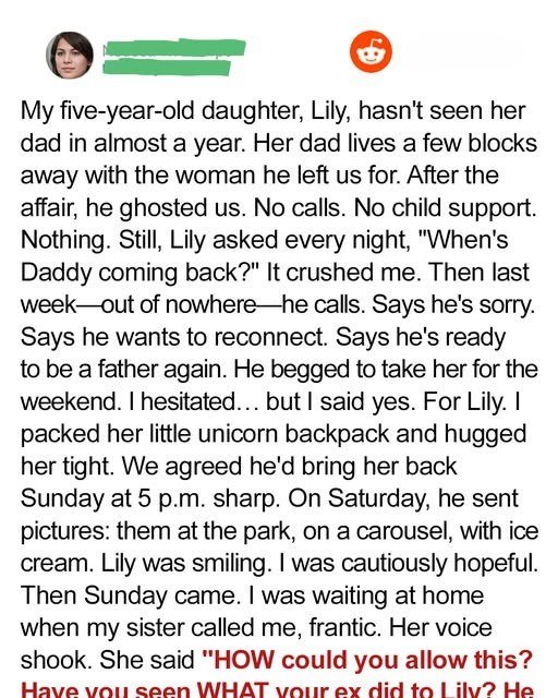 When my ex reached out after years of distance, saying he wanted to reconnect with our daughter, hope flickered inside me. Our little girl had grown up believing in love and family, and even though it had been difficult raising her alone, I wanted her to feel supported by both parents. So when he promised a special weekend together, I chose to believe it might be the start of something healing — not for us, but for her.